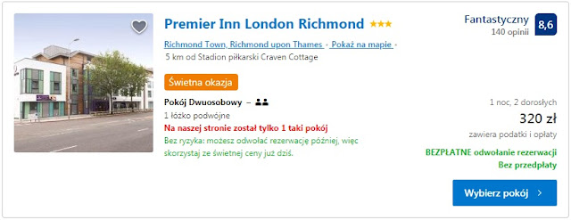 Proponujemy dwie opcje noclegowe na jedną dobę położone nieopodal Craven Cottage. Pierwsza z nich to Halpin House (South Kensington) za 294 zł (147 zł/os/doba). Inna opcja to pobyt w Premier Inn London Richmond za 320 zł (160 zł/os/doba).