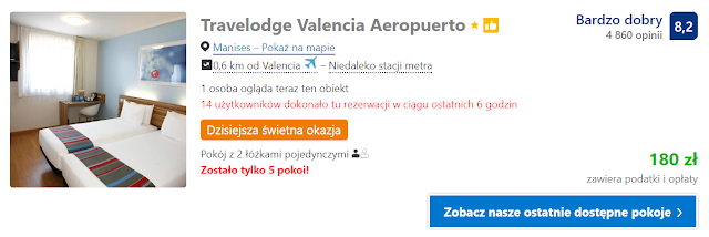 Innym obiektem godnym uwagi jest Travelodge Valencia Aeropuerto. Tutaj cena za pobyt w dniach 28 lutego – 1 marca wynosi 219 zł za jedną osobę wraz ze śniadaniem oraz 180 za dwie osoby (90 zł os./noc).