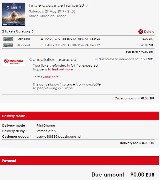 Bilet na mecz do kupienia na stronie Stade de France, które będzie gościć finał Pucharu Francji => https://billets.stadefrance.com/selection/event/date?productId=1073474871&lang=en gdzie za najtańsze bilety zapłacimy 45€ (ok. 194zł). Do kupna biletu niezbędna jest bezpłatna rejestracja na stronie Stade de France. Bilet drukujemy samodzielnie.