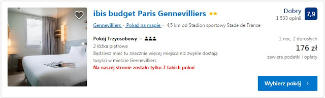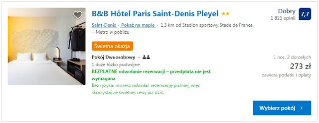 Oferujemy dwie opcje noclegowe na pobyt w Paryżu, oba obiekty znajdują się nieopodal Stade de France. Pierwsza, tańsza z nich to ibis budget Paris Gennevilliers za 176 zł (88 zł/os/doba). Inna opcja, bliżej obiektu to B&B Hotel Paris Saint-Denis Pleyel za 273 zł (137 zł/os/doba).