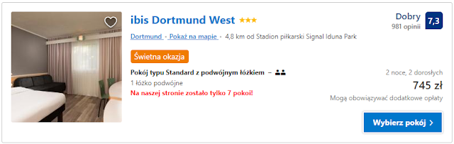 Bliżej stadionu gospodarzy znajduje się ibis Dortmund West, w którym koszta dwudniowego noclegu wynoszą 782 zł za osobę i 828 zł za dwie osoby.