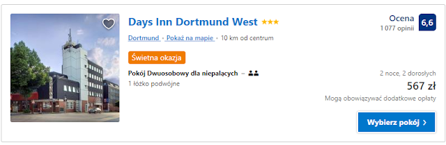 W Dortmundzie najkorzystniej będzie zatrzymać się w obiekcie Days Inn Dortmund West zlokalizowanym w zachodniej części miasta. Za dwa noclegi w terminie 30 października – 1 listopad zapłacimy 575 zł za osobę i 667 zł za dwie osoby.