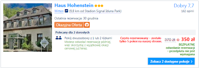 Pierwsza propozycja to nocleg w sąsiednim miesicie Witten – swobodnie dotrzemy do Dortmundu komunikacja miejską lub pociągiem. Obiekt jest oddalony ok 10 km od samego stadionu. Cena za pokój dwuosobowy to 350 zł za noc (ok 175 zł za osobę za noc) zarezerwuj TUTAJ====>