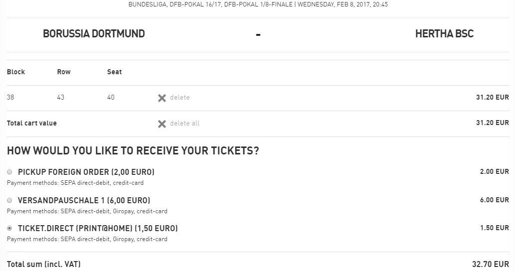 Bilety na ten mecz do kupienia na oficjalnej stronie drużyny z Dortmundu => https://www.eventimsports.de/ols/bvb/en/bundesliga/channel/shop/areaplan/venue/event/73561 gdzie wyboru dokonujemy z planu stadionu. Cena najtańszych biletów jakie pozostały wynosi 32,70€ (najtańsza opcja z własnym wydrukiem biletu).