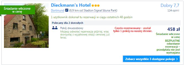 Drugą propozycja to już nocleg w Dortmundzie jest nieco droższy niż wymieniony powyżej ale odległość od stadionu to niecałe 7 km. Cena za wynajem pokoju dwuosobowego na 1 noc to 458 zł (ok 230 zł za osobę za noc) zarezerwuj TUTAJ====>