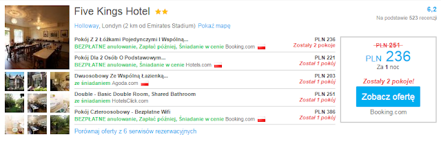 Jeżeli zdecydujemy się na nocleg w Londynie to proponujemy obiekty położone w pobliżu Emirates Stadium. Pokoje dwuosobowe w hotelu 2 lub 3 gwiazdkowym to koszt w graniach 230 zł zarezerwuj TUTAJ====>