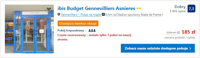 Na pobyt na jedną noc dla dwóch osób proponujemy dwa obiekty w różnych cenach, ale położone nieopodal stadionu. Pierwszy obiekt to ibis Budget Gennevilliers Asnieres za 185 zł (93 zł/os/noc). Inna możliwość na nocleg to hotelF1 Saint Denis Centre Basilique za 225 zł (113 zł/os/noc).