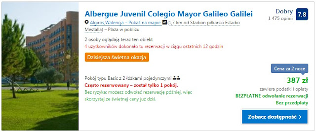 Proponujemy dwie opcje noclegowe nieopodal Estadio Mestalla, różnica cenowa uzależniona jest przede wszystkim od warunków i dostępności do prywatnej łazienki. Tańsza opcja to Nice Room za 258 zł (65 zł/os/noc), inna możliwość do pobytu na dwie noce to Albergue Juvenil Colegio Mayor Galileo Galilei, w którym zapłacimy 387 zł (97 zł/os/noc).