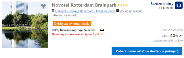 Polecamy oddalony o 2,5 kilometra od stadionu Feyenoordu Novotel Rotterdam Brainpark, w którym cena za jednodniowy pobyt w pokoju jednoosobowym wynosi 480 zł, natomiast za dwuosobowy 406 zł (203 zł os./noc).