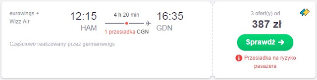 Istnieje również możliwość przelotu do Gdańska z przesiadką w Kolonii za 387 zł REZERWUJ====>