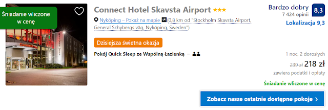 Do wyboru mamy również znajdujący się w promieniu kilometra od lotniska Connect Hotel Skavsta Airport. Za nocleg w pokoju dwuosobowym ze śniadaniem oraz prywatną łazienką zapłacimy 307 zł (153,5 zł os./noc).