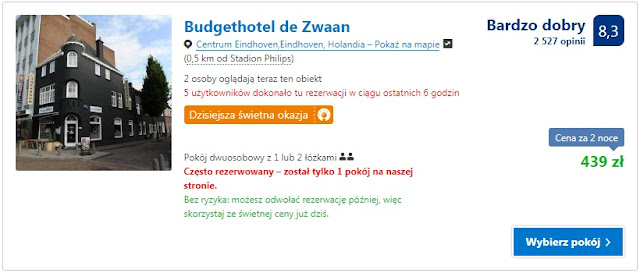 Jako propozycje wrzucamy dwa hotele położone niedaleko Philips Stadion w Eindhoven: Budgethotel de Zwaan oraz Lightotel Eindhoven. Pobyty w obu na dwie noce dla dwóch osób to koszt 439 zł (110 zł/os/noc).