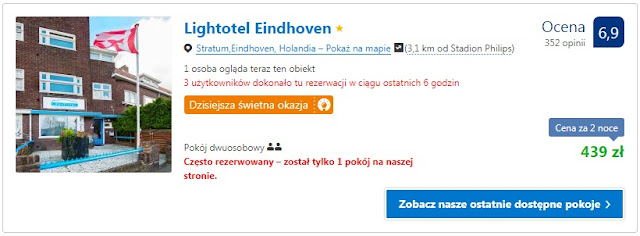 Jako propozycje wrzucamy dwa hotele położone niedaleko Philips Stadion w Eindhoven: Budgethotel de Zwaan oraz Lightotel Eindhoven. Pobyty w obu na dwie noce dla dwóch osób to koszt 439 zł (110 zł/os/noc).