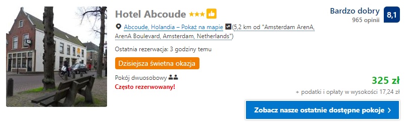 Dla kibiców, którzy pozostaną w Amsterdamie na noc proponujemy nocleg w Hotel Abcoude. Koszt pobytu w pokoju dwuosobowym wynosi ok. 342 zł (171 zł os./noc).