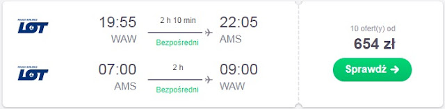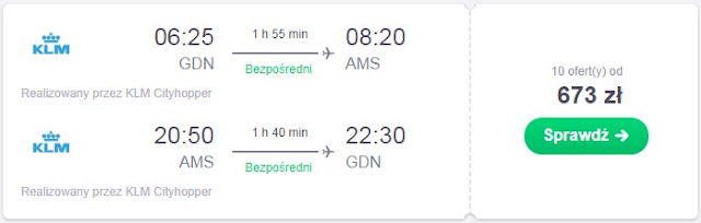 Proponujemy przeloty w obie strony połączeniami bezpośrednimi pomiędzy Polską, a Holandią w dniach 09-11.08. Istnieje możliwość podróży do Amsterdamu z Warszawy za 654 zł REZERWUJ====> oraz z Gdańska za 673 zł REZERWUJ====>