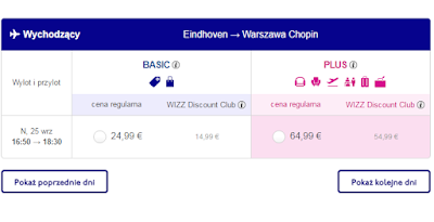 (W naszej wyszukiwarce ceny niższe dla klubowiczów WIZZ Discount Club widoczne są dopiero po przekierowaniu na stronę bezpośrednią (po wybraniu dowolnej opcji)