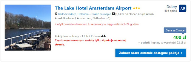 Proponujemy pobyt na dwie noce dla dwóch osób w danych obiektach: The Lake Hotel Amsterdam Airport (położony 4 km od lotniska) za 400 zł (100 zł/os/noc) bądź w ibis budget Amsterdam City South (leżącym znacznie bliżej stadionu) za 472 zł (118 zł/os/noc).