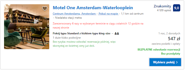 W centrum Amsterdamu polecamy Motel One Amsterdam-Waterlooplein, w którym koszta pobytu to 455 zł i 547 zł odpowiednio dla jednej i dwóch osób.