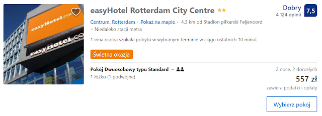 Mniej zapłacimy przy wyborze easyHotel Rotterdam City Centre. Cena za pobyt w terminie 21-23 marca wynosi 557 zł za jedną i dwie osoby (ok. 139,50 zł os./noc).