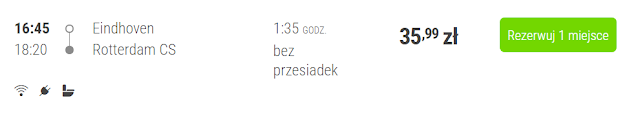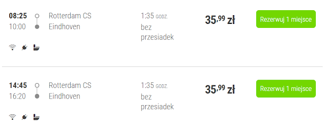 Dla kibiców, którzy nie zdążą na autobus odjeżdżający do Rotterdamu zalecamy pociąg. Za kurs zapłacimy 19,40 EUR (ok. 88 zł) REZERWUJ====>.