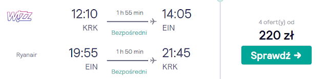 Podróż do Holandii planujemy w dniach 21-23 marca. W pierwszej kolejności oferujemy wylot do Eindhoven, do którego (wraz z powrotem do kraju) dostaniemy się z Katowic za 152 zł* (cena regularna 238 zł) REZERWUJ====> oraz Krakowa za 190 zł* (cena regularna 219 zł) REZERWUJ====>.