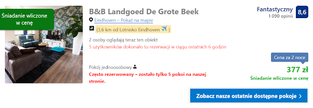 W zależności od preferencji polecamy nocleg w B&B Landgoed De Grote Beek i Campanile Hotel & Restaurant Eindhoven, które są oddalone o niecałe 4 kilometry od lotniska. Koszt pobytu w tych obiektach wynosi kolejno 407 zł wraz ze śniadaniem (pokój jednoosobowy) oraz 527 zł (pokój dwuosobowy, 263,5 zł os./noc). We wszystkich podanych cenach uwzględniliśmy już koszt podatku miejskiego.
