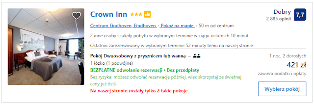 Pierwszy obiekt proponowanym przez nas to Hotel Parkzicht Eindhoven, w którym zatrzymamy się na jeden nocleg (14-15 marca) w cenie 322 zł za osobę i 337 zł za dwie osoby.