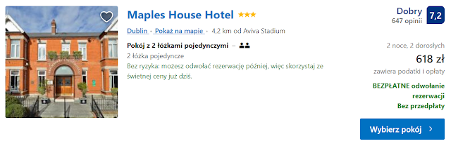 Proponujemy nocleg w dniach 13-15 czerwca w oddalonym niecałe 2 km od Aviva Stadium Leeson Inn Downtown. Za dwudniowy pobyt w pokoju dwuosobowym zapłacimy 618 zł (ok. 154,5 zł os./noc).