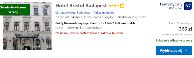 1,5 km od miejsca wydarzeń znajduje się Hotel Bristol Budapest, który oferuje jednodniowy nocleg w pokoju jedno i dwuosobowym ze śniadaniem za kolejno 353 zł oraz 366 zł (183 zł os./noc).