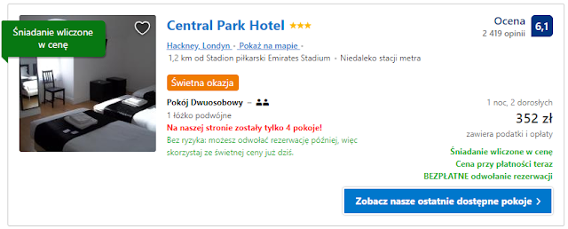 Decydując się na nocleg w okolicach stadionu polecamy zatrzymać się w Central Park Hotel. Koszt pobytu to 317 zł w przypadku jednej osoby i 351 zł za dwie osoby. Ponadto w cenie noclegu mamy zapewnione śniadanie.