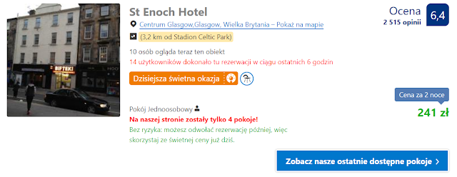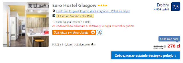 Proponujemy pobyt w Euro Hostel Glasgow gdzie za nocleg w dniach 12-14 grudnia w pokoju dwuosobowym zapłacimy 309 zł ( 77 zł os./noc). Alternatywą może być St Enoch Hotel. Za dwie doby w pokoju jednoosobowym zapłacimy 241 zł (120,5 zł) noc.