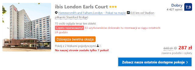 Proponujemy oddalony o 800 metrów ibis London Earls Court, w którym za nocleg w pokoju jedno i dwuosobowym zapłacimy kolejno 339 zł oraz 287 zł (143,5 zł os./noc).