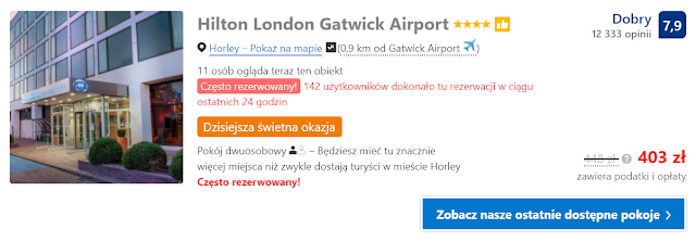 Dla odlatujących wczesnym samolotem z lotniska Londyn Gatwick oferujemy Hilton London Gatwick Airport. W tym obiekcie doba hotelowa warta jest 447 zł za jedną oraz 403 zł (201,5 zł os./noc) za dwie osoby.