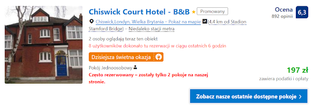 Proponujemy pobyt w dniach 29-30 listopada w Chiswick Court Hotel – B&B. Koszt pobytu w pokoju jednoosobowym wynosi 197 zł, zaś za dwuosobowy 241 zł (120,5 os./noc).