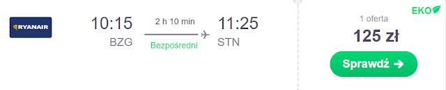 Z lotniska Londyn Stansted dotrzemy do Warszawy Modlin za 77 zł REZERWUJ====>, Bydgoszczy za 97 zł REZERWUJ====>, Szczecina za 158 zł REZERWUJ====>, Łodzi za 178 zł REZERWUJ====>, Poznania za 178 zł REZERWUJ====> oraz Rzeszowa za 193 zł REZERWUJ====>.