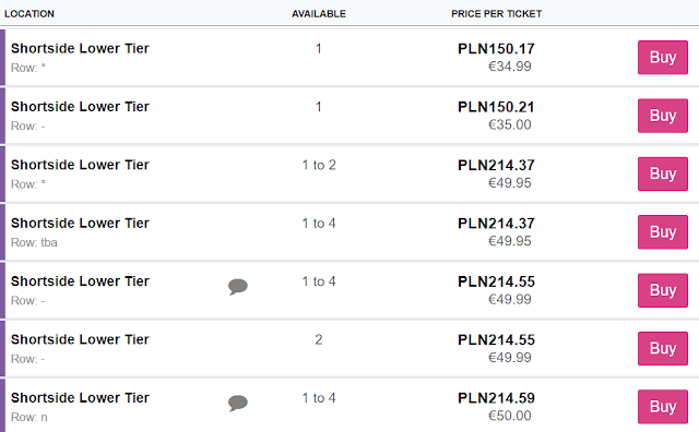 Aktualnie zalecamy kupno biletów za pośrednictwem rynku wtórnego. Ceny wejściówek wraz z opłatami manipulacyjnymi kosztują 44 EUR (ok. 189 zł) REZERWUJ====>.