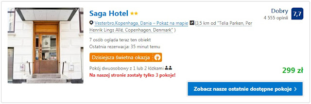 Na pobyt na jedną noc proponujemy dwa obiekty położone nieopodal stadionu, których cena uzależniona jest między innymi od dostępu do prywatnej łazienki. Pierwsza z opcji to Saga Hotel za 299 zł (150 zł/os/noc), inna możliwość to nocleg w a&o Copenhagen Norrebro za 311 zł (156 zł/os/noc).