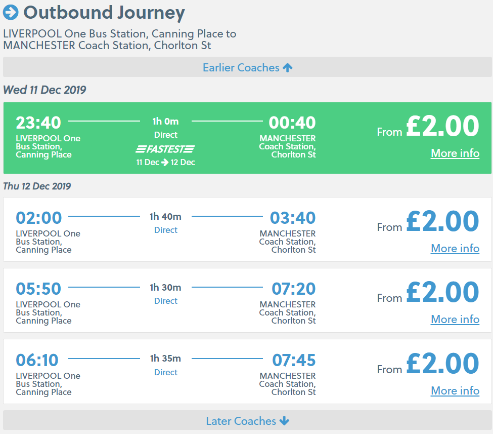 Ten sam przewoźnik zawiezie nas z Leeds do Manchesteru od 3,40 GBP (ok. 17 zł) REZERWUJ====>.