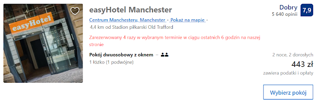 Kibice, którzy przybędą do Manchesteru dzień wcześniej oferujemy easyHotel Manchester. Za dwudniowy pobyt w tym hotelu w pokoju dwuosobowym zapłacimy 443 zł (ok. 111 zł os./noc).