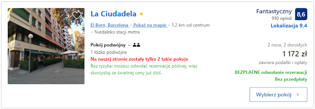 Z kolei w samej już Barcelonie możemy spędzić dwie noce w obiekcie La Ciudadela. Za pokój dwuosobowy zapłacimy 1172 zł zarówno dla jednej, jak i dla dwóch osób.