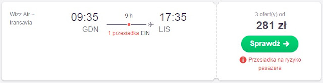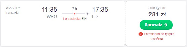 Proponujemy wylot do Lizbony jeszcze w dniu spotkania, obie propozycje dotyczą przelotów z przesiadką w Eindhoven. W ten sposób możemy zabrać się z Gdańska REZERWUJ====> oraz z Wrocławia REZERWUJ====>, a za przelot zapłacimy w obu przypadkach 281 zł.