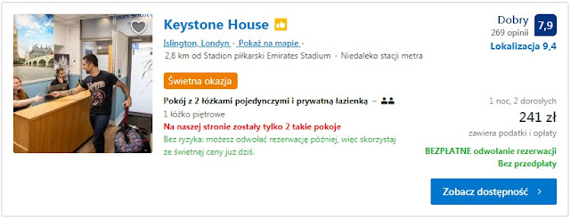 Oferujemy dwa obiekty noclegowe położone nieopodal Emirates Stadium. Pierwszy z nich to Palmers Lodge Swiss Cottage za 164 zł (82 zł/os/doba). Nieco droższa możliwość to obiekt Keystone House za 241 zł (121 zł/os/doba).