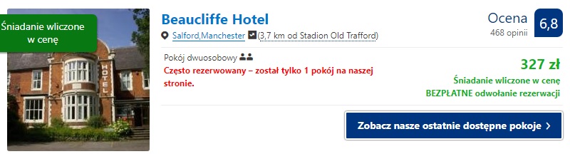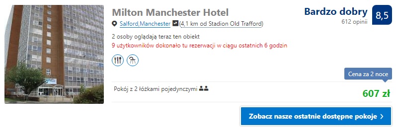 Proponujemy nocleg w dwóch obiektach położonych niedaleko stadionu. Pierwszym jest Milton Manchester Hotel gdzie za dwie noce w pokoju dwuosobowym zapłacimy 607 zł ( ok. 152 zł/ os./ noc). Drugą propozycją jest Beaucliffe Hotel gdzie za noc w pokoju dwuosobowym zapłacimy 327 zł (ok. 164 zł/os./noc).