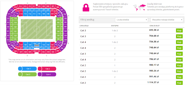 Bilety dostępne są od ok.693 zł.W przypadku chęci dostarczenia przesyłki z biletem poza teren Szwecji należy doliczyć prowizje za transport ok 60 zł. Można jednak skorzystać z bezpłatnej dostawy na terenie Szwecji jeśli przesyłkę zamówimy do hotelu, w którym będziemy stacjonować na czas meczu. W tej opcji o spodziewanej przesyłce należy uprzedzić personel hotelu zarezerwuj bilet TUTAJ====>