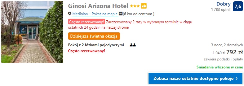 Proponujemy nocleg w obiekcie Ginosi Arizona Hotel gdzie za 3 noce w pokoju dwuosobowym zapłacimy 792 zł (132 zł/os./noc). Hotel oddalony jest kilka kilometrów od centrum oraz toru Monza.