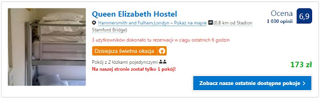 W kwestii noclegu na jedną noc jako propozycję składamy dwa obiekty nieopodal stadionu, których cena uzależniona jest m.in. od dostępu do prywatnej łazienki. Tańsza opcja za 173 zł (ok. 87 zł/os/noc) to Queen Elizabeth Hostel, natomiast ta nieco droższa, której koszt wynosi 240 zł (120 zł/os/noc) to Hashtag Shepherd’s Bush.