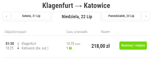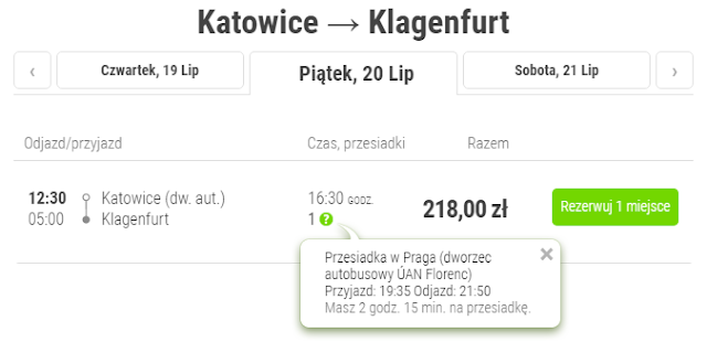 Proponujemy transport autobusowy liniami Flixbus z Katowic do Klagenfurtu dzień przed meczem 20.07 (przesiadka w Pradze) . Za kurs zapłacimy 218 zł REZERWUJ====>