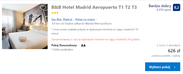 Kibice, którzy zdecydują się na dwudniowy pobyt oferujemy B&B Hotel Madrid Aeropuerto T1 T2 T3. Za nocleg zapłacimy 672 zł za jedną oraz 626 zł za dwie osoby (156,5 zł os./noc).