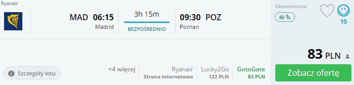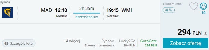 Powrót planujemy dzień po meczu do Warszawy za 294 zł REZERWUJ ==== >. Ze względu na brak lotów w rozsądnej cenie z Madrytu do Wrocławia proponujemy powrót do Poznania dzień po meczu w cenie 83 zł REZERWUJ ==== >
