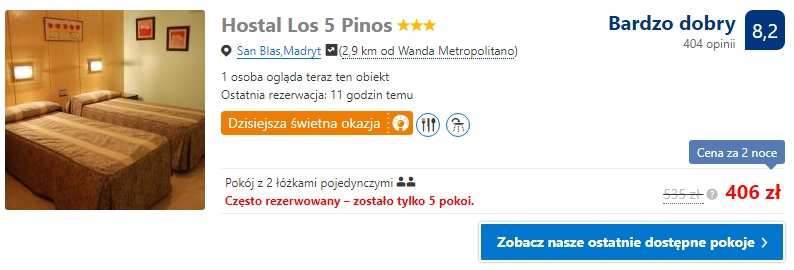 Proponujemy pobyt w dwóch miejscach (wysoko ocenionych przez użytkowników) nieopodal stadionu. Pierwszym jest Hostal Los 5 Pinos gdzie za dwie noce w pokoju dwuosobowym zapłacimy 406 zł ( ok. 102 zł/ os./ noc). Drugim miejscem jest Hotel Don Luis gdzie za dwie noce w pokoju dwuosobowym zapłacimy 412 zł ( ok. 103 zł/ os./ noc).